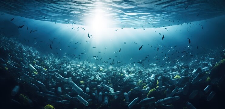 Piles of rubbish on the seabed with clear water and light requirements from above. generative AI