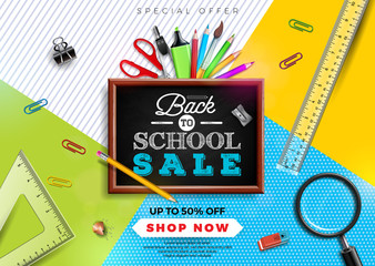 Back to school sale design with colorful pencil, brush and other school items on yellow background. Vector Illustration with Special Offer Typography Elements for Coupon, Voucher, Banner, Flyer