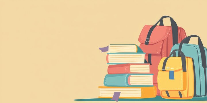 Illustration of a school orientation flyer with books and backpacks in the design.