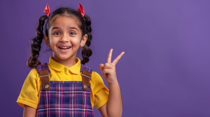 Primary school smiling boy girl with backpack showing victory peace sign smiling at camera. Copy space for advertising blank concept. Back to school. Childhood, education, products for children