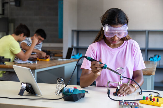 Teen African American female high school student in electronics class working on a project alone. Copy space.