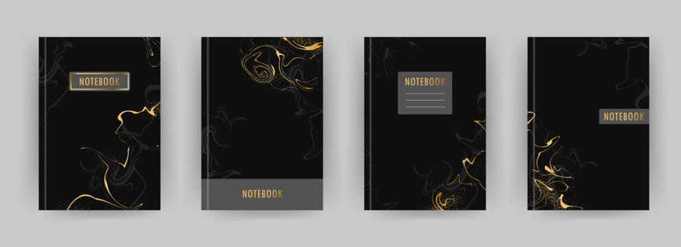 Cover page notebook collection. Templates with golden liquid texture. Perfect for diary, books, magazines, journals, catalogs, planners and flyers. Vector layouts. Minimalist style.