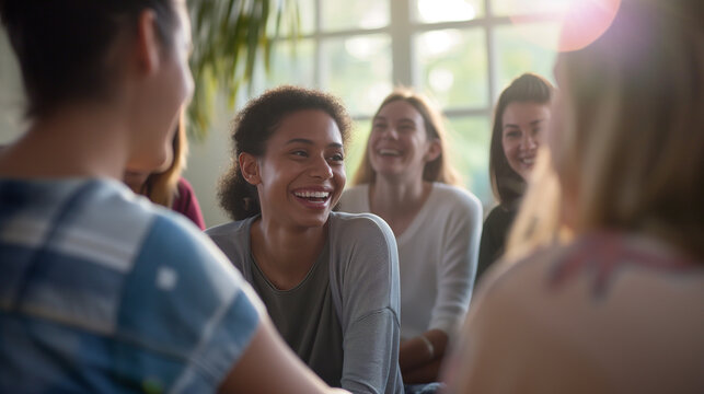 Happy young woman laughing and smiling with friends in a group therapy meeting setting in a support circle or possibly students in a study group workshop