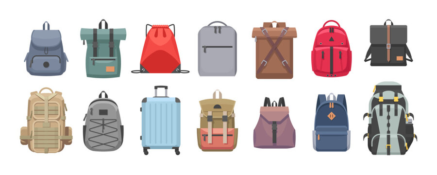 Flat set of backpacks. Different backpacks on white background. Vector illustration