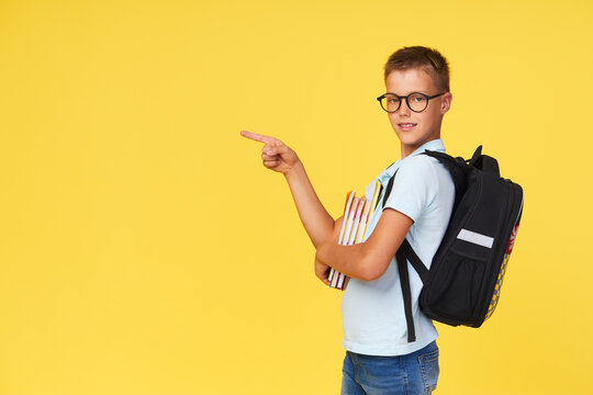 Portrait of a schoolboy in glasses with textbooks and a backpack on a yellow background pointing to the left. Back to school