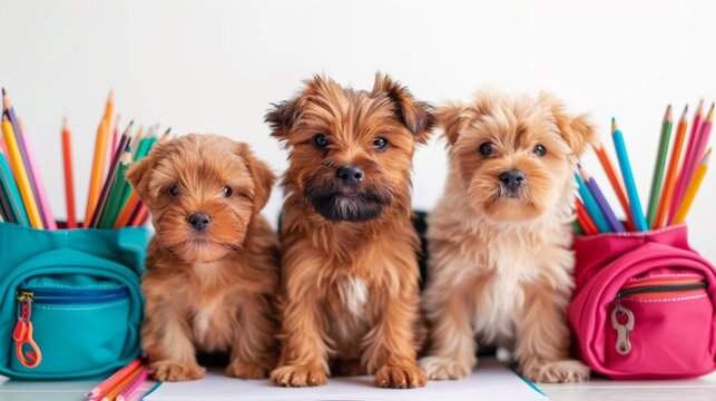 Three cute puppies sit between colorful pencil pouches, looking straight into the camera