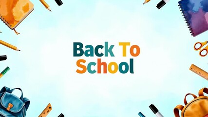 Colorful back-to-school themed design featuring stationery and backpacks on a light background