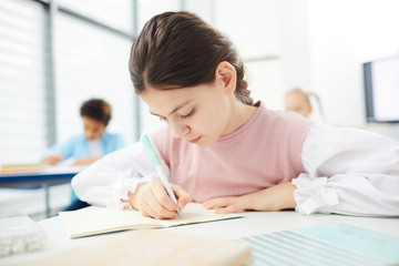 Caucasian female middle schooler with dark brown hair sitting at school desk writing essay, horizontal medium close up portrait