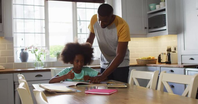 African american daughter and her father doing her schoolwork together at kitchen table