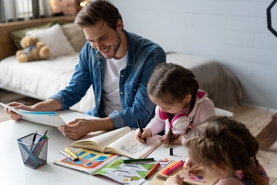 A father helping his little daughter to do her homework for the school