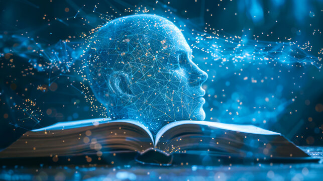 AI Head Emerging from Open Book. A digital head representing artificial intelligence emerges from the pages of an open book, symbolizing the fusion of knowledge and technology.