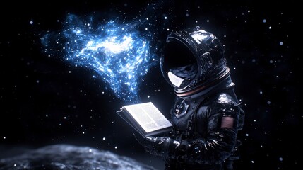 An open book with cosmic dusk floating out of it. Generative AI.