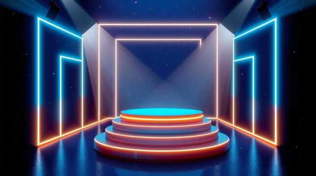 Futuristic neon circular podium with vibrant light patterns for event display design