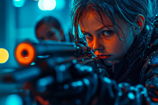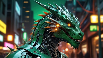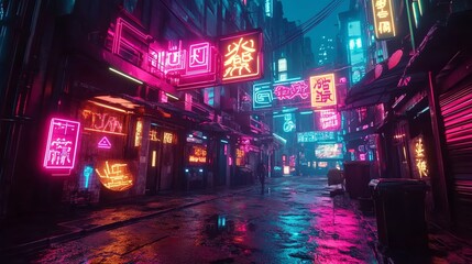 Neon signs illuminate a cyberpunk city street, creating a vibrant and futuristic atmosphere.