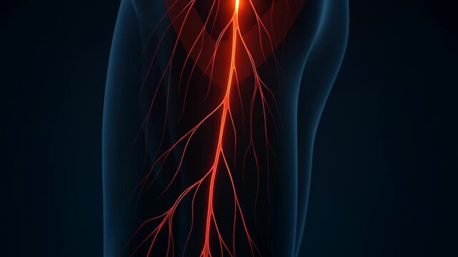 Digital illustration of sciatic nerve pain radiating from lower back to leg, highlighting neural discomfort and anatomical detail.