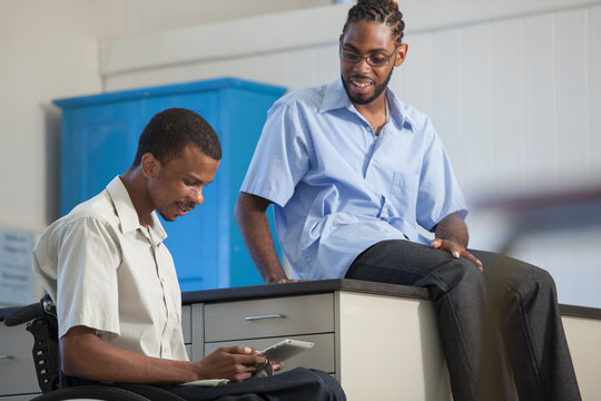 Two students who had Spinal Meningitis looking at the data on a tablet in a science lab