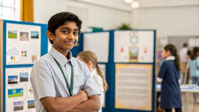 Indian Student in Science Fair – A student presenting a science project or model at a school exhibition.