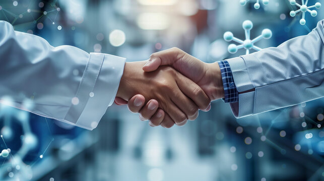 Mixed media of group of multinational engineers shaking hands and science technology concept. System engineering. Research and development. Wide angle visual for banners or advertisements.