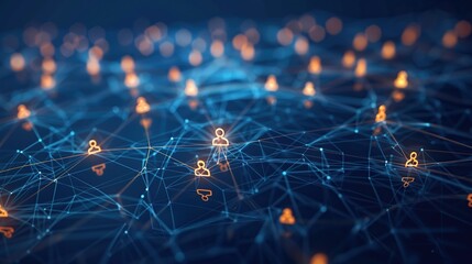 illustration connecting people on the internet, social network connection, glowing connections between people icons on dark blue background. Digital technology.