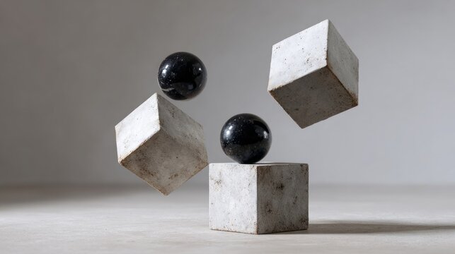 Black spheres flirt above concrete cubes, embodying gravity's playful tango; a spatial nod to National Science Week and World Art Day