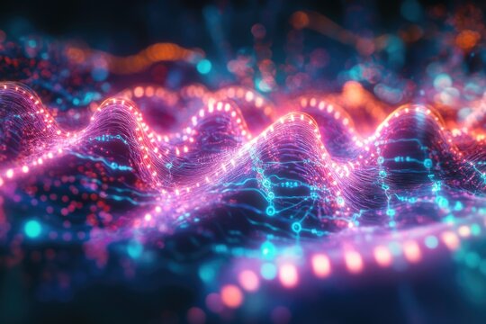 Abstract digital visualization of a luminous blue wave form with floating spheres and bokeh lights suggesting fluid motion and scientific concepts