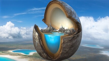Surreal planetary core with aquatic environment and levitating terrain, great for adventure themes or scientific curiosity graphics.