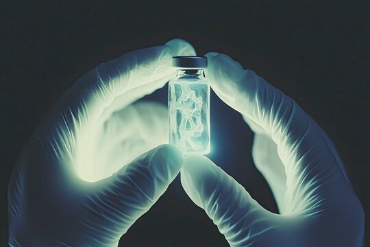 Gloved Hands Holding a Vial of Glowing Substance - Scientific Discovery Concept