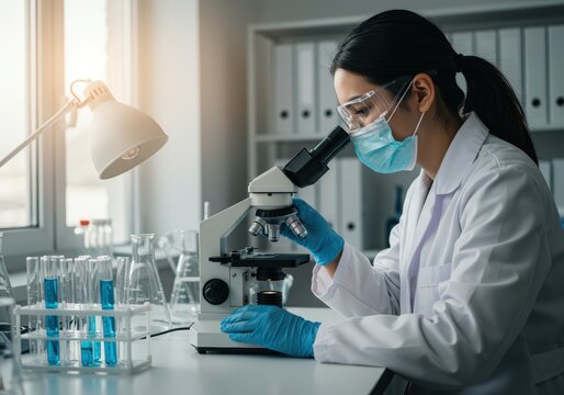 Focused scientist using microscope for research and discovery