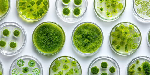 Microalgae Variety in Laboratory Petri Dishes wallpaper pattern. Top view of diverse green microalgae samples in scientific petri dishes on white background.