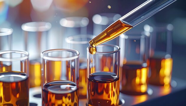 Amber liquid being dispensed into test tubes in a scientific research setting.