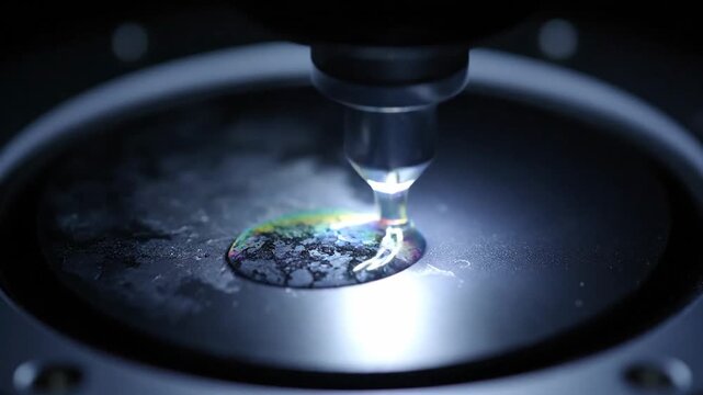 Close-up of liquid drop being tested with scientific instrument