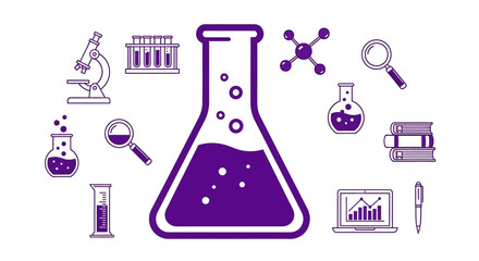 scientific laboratory equipment with a flask and a microscope icon representing scientific