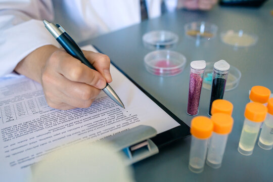 Female scientist hand filling investigation form of small plastic particles on glitter composition