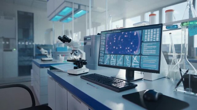 In a state-of-the-art lab, researchers analyze samples using a microscope. Screens display genetic data and results, showcasing cutting-edge scientific advancements.