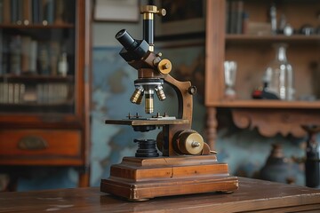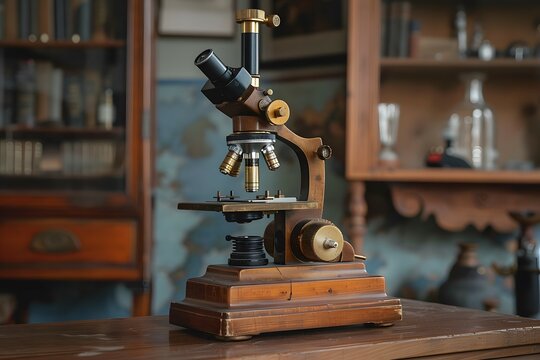 A vintage microscope with brass accents and a wooden base, evoking the history and legacy of scientific discovery