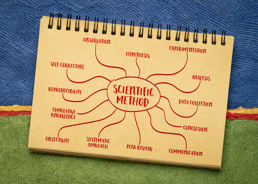 scientific method infographics or mind map sketch in a spiral notebook, science and research concept