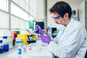 Medical or scientific researcher or man doctor looking at a test tube of clear solution in a laboratory