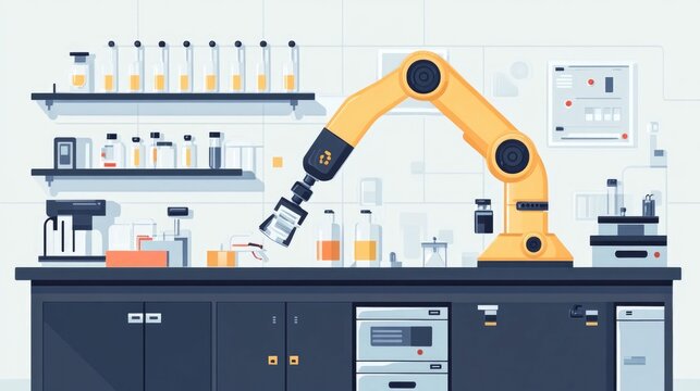 Robotic Arm in Modern Research Laboratory Flat Design Showcasing Advanced Scientific Equipment Technology and Innovation in a Futuristic Workspace Environment