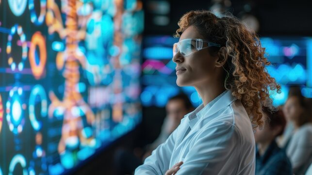 Futuristic Genetic Research Presentation in Conference Hall - Scientist Sharing Insights with Academic Audience (Copy Space Overlay)