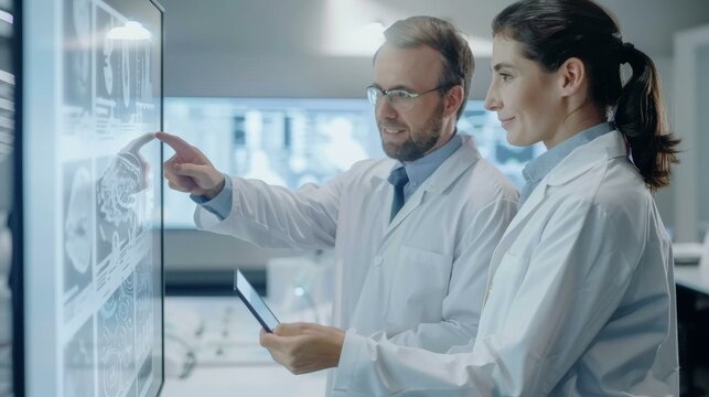 Science presentation by a female scientist in a lab with colleagues analyzing data, scientific