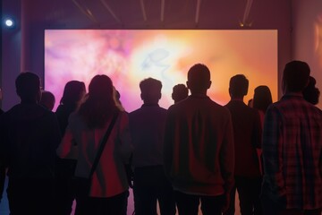 Group of people standing in front of a projection screen, engrossed in a scientific presentation at a bustling conference hall