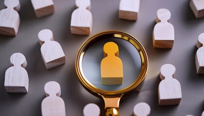 Concept of investigation, research, analysis, recrutation. Wooden figurines and magnifying glass