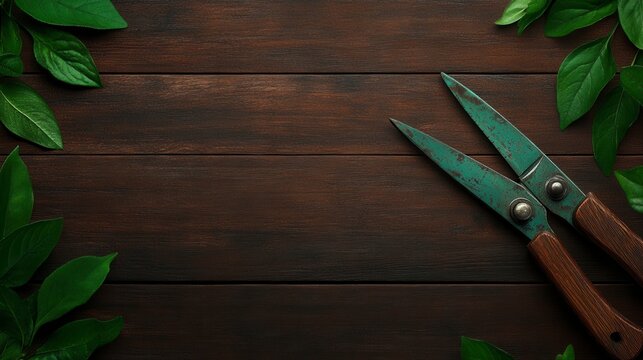 Vintage garden scissors on a rustic wooden background surrounded by fresh green leaves for gardening themes