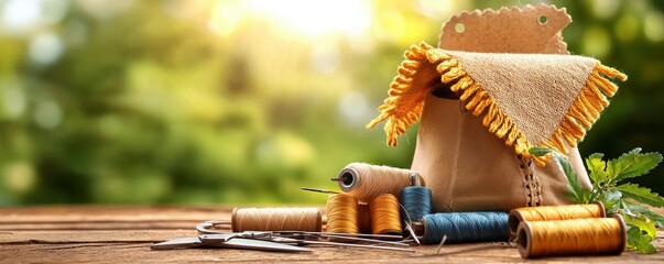 Creative sewing crafts in nature handmade supplies outdoor setting close-up view artistic exploration