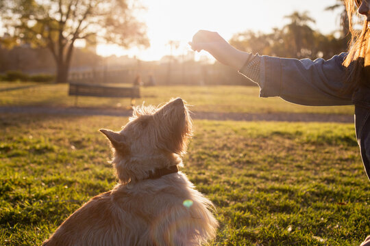 A dog plays with its owner in the city park of Buenos Aires