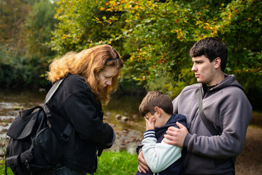 Upset woman trying to have a serious talk with her son, scold him little for bad behavior, older brother comforting younger brother, family upbringing scene