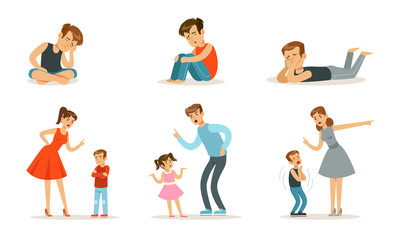 Angry father scream scold small unhappy kid covering ears from aggression. Mad aggressive parent lecture shout at unhappy little son, avoiding domestic violence. Vector illustration.