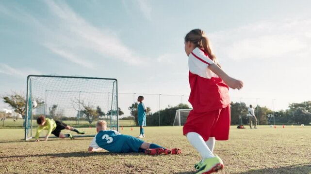 Football, player and children in stadium for shooting, practice and exercise for sport competition. Soccer field, goalkeeper and kids athletes for training, kick and motor coordination with scoring