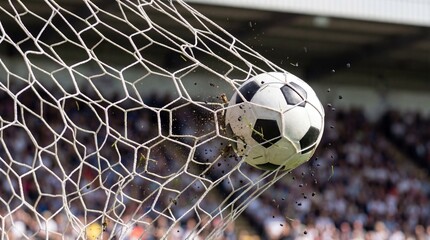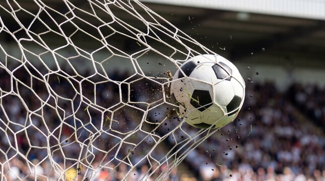 Dynamic soccer ball hitting net scoring winning goal with flying debris.
