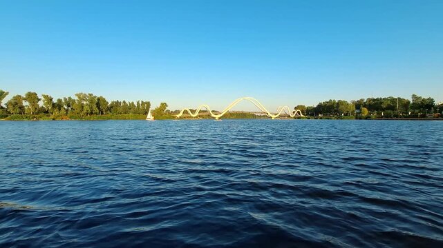 Dnieper River in Kyiv city, near Wave Bridge and Obolonsky Island. Video footage from floating yacht